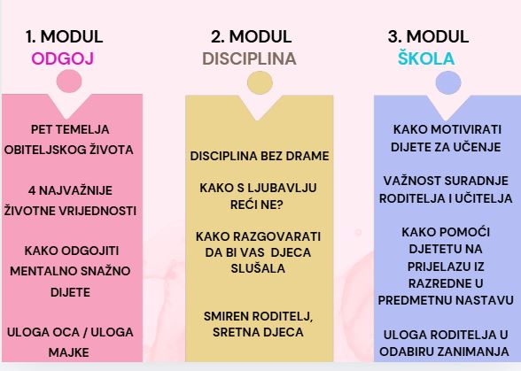 - pojasniti ulogu roditelja u mnogim životnim izazovima djece: digitalna tehnologija, postavljanje odgojnih granica, razvijanje radnih navika i pomaganje u učenju odabir srednje škole itd.